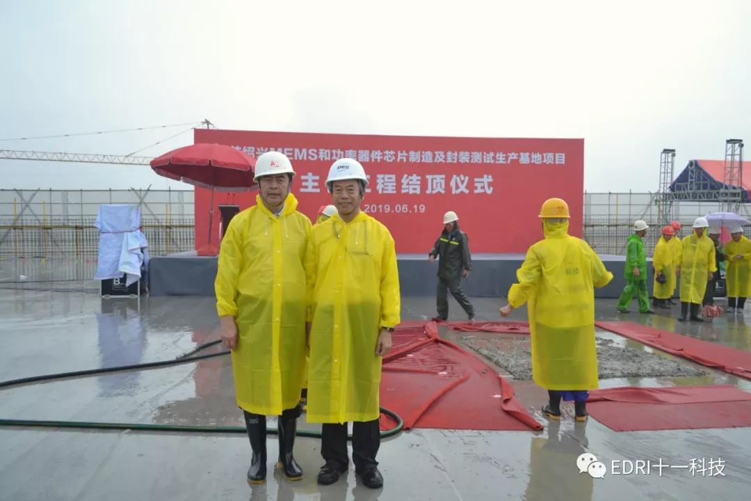 2019年6月19日上午,十一科技總承包的中芯紹興MEMS和功率器件芯片制造及封裝測試生產基地項目隆重舉行主體工程封頂儀式。紹興市委書記馬衛光、紹興市市委秘書長陸維、紹興市副市長孫哲君、中芯國際CFO高永崗、中芯紹興董事長丁國興、中芯紹興總經理趙奇、十一科技董事長、黨委書記趙振元、高級副院長白焰等領導出席儀式。中芯國際CFO高永崗、中芯紹興總經理趙奇先后致辭,對十一科技、各參建方及紹興市各級市政領導對項目的大力支持和辛勤付出表示感謝。在儀式上,趙振元與馬衛光書記、高永崗CFO、趙奇總經理等領導親切交談,并與出席儀式的領導共同揮鏟為主體廠房的結構封頂完成最后一方混凝土的澆筑。
